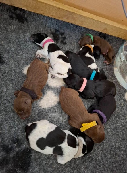 5 femelles et 4 mâles, avec presque toutes les couleurs du Braque représentées (sauf le marron truité).